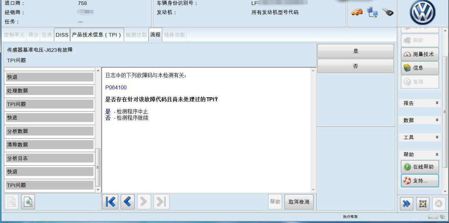 2、用VAS6150B 进行诊断发动机控制单元故障显示P064100 传感器参考电压 A 断路,其它控制单元没有故障存储。