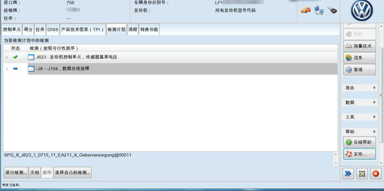 3、高7 发动机传感器上基准电压的元件很多(G300 霍尔传感器,G247 燃油压力传感器,G299进气温度传感器2,G28 发动机转速传感器,GX26 增压压力传感器,G42 进气温度传感器等),不知道传感器A 点的具体位置,通过检测计划来确定故障原因,选择检测计划,进行检测。