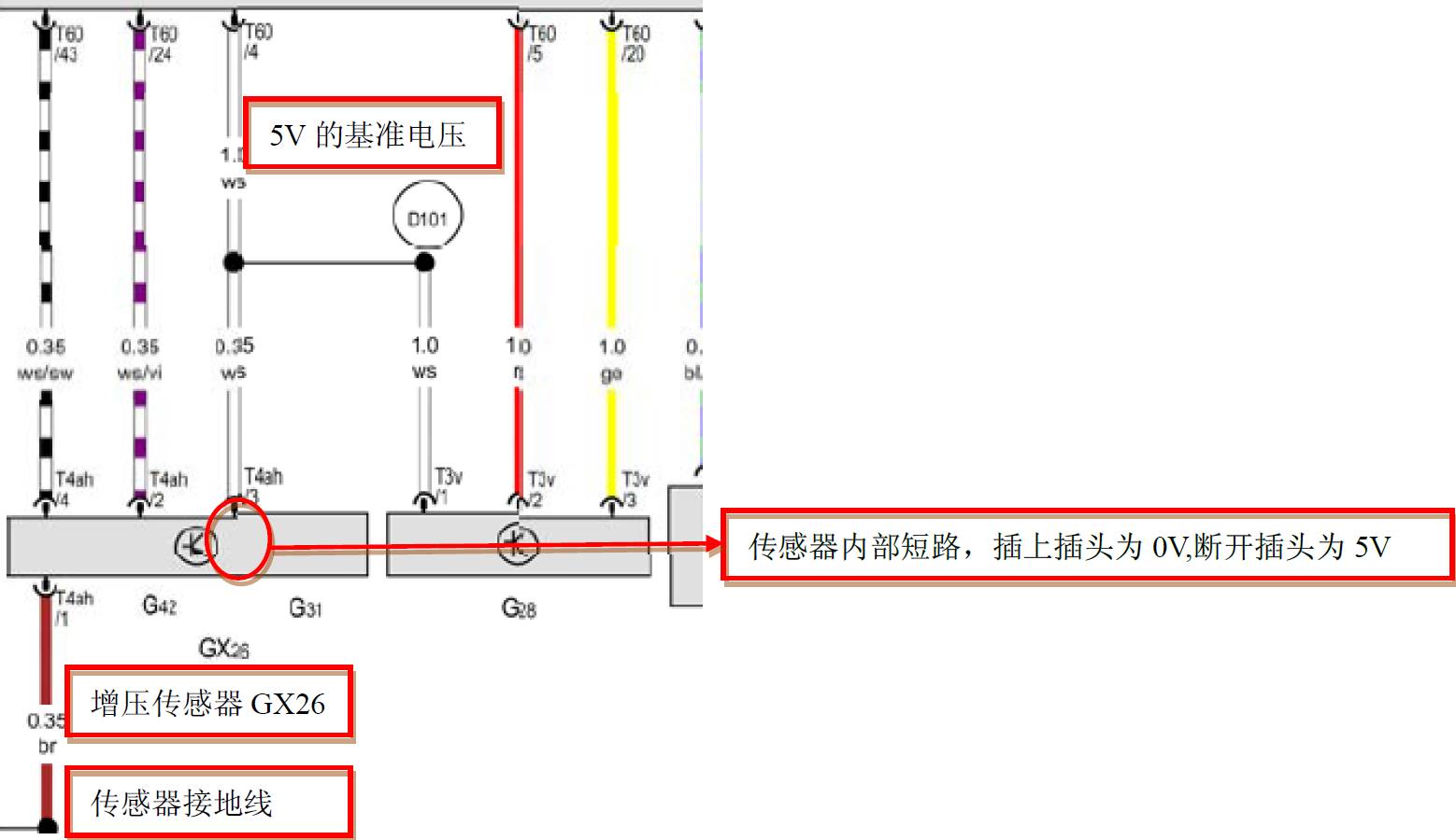 故障原因分析:增压压力传感器G31 内部短路,导致A点电压为低电位,从而发动机相应传感器工作失常,发动机加速不良,怠速抖动。