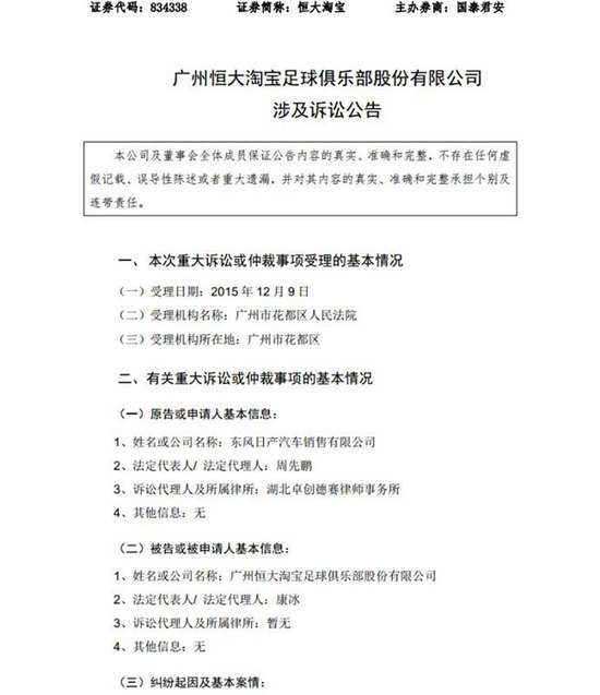 广州恒大淘宝队此前在世俱杯中发挥出色,进军世俱杯半决赛。此引无数球迷激动不已。然而其因11月21日亚冠赛场上擅自更换球衣胸前广告而卷入舆论风波,其赞助商东风日产依旧不打算息事宁人,据悉,东风日产已经就此事提起诉讼。