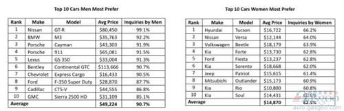 《财富》以iSeeCars.com网站数据为基础。该网站针对消费者在线500,000次二手车搜索进行调查统计,计算男性和女性在某款车的相关搜索中所占比例。根据统计,最受男性欢迎的车型为日产GT—R,该车平均售价80,450美元;最受女性欢迎的车型为现代途胜,平均售价16,722美元。