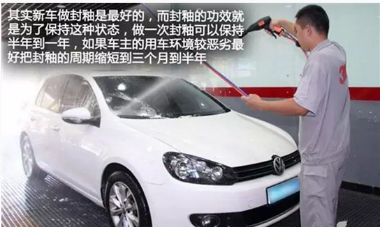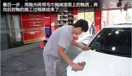 封釉其实也是蜡的一种,用柔软的羊毛或海绵通过振抛机的高速振动和摩擦,利用釉特有的渗透性和黏附性把釉分子强力渗透到车辆油漆表面的微小缝隙中去。封釉后的车身漆面能够达到甚至超过原车漆效果,使旧车更新、新车更亮,并同时具备抗高温、密封、抗氧化、增光、耐水洗以及抗腐蚀等特点,一般封釉半年之内可不用打蜡。