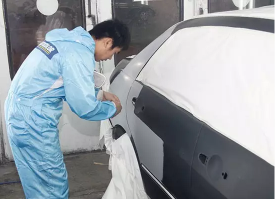 损伤部位外围20 cm距离区域内飞溅的涂料会比较多,可按照由近到远的顺序使用胶带配合遮蔽纸进行遮蔽,遮蔽过程中要注意对处在喷涂区域中的一些小部位进行特别遮蔽。