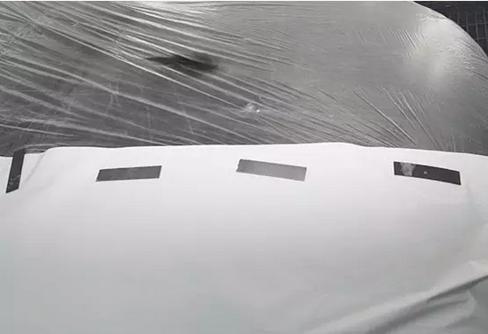 而损伤部位外围20 cm距离以外的区域飞溅的涂料会比较少,则可以按照由近到远的顺序使用磁铁配合遮蔽薄膜进行遮蔽,遮蔽薄膜由于其材质的特殊性比较容易破损,但由于将其与磁铁进行配合使用,可以在其破损时拿起磁铁,将未破损的遮蔽薄膜将破损处进行遮盖,之后使用磁铁再次压实即可。