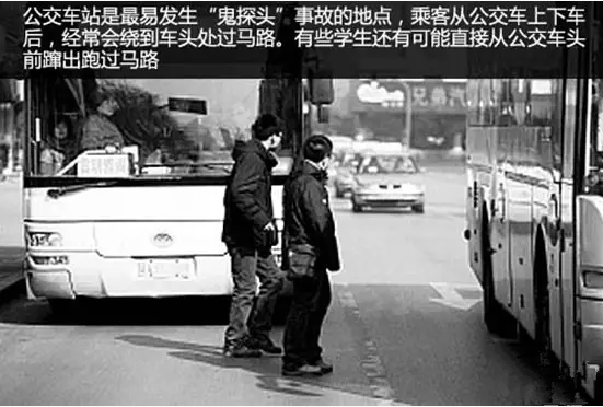 公交车站是最易发生“鬼探头”事故的地点,乘客从公交车上下车后,经常会绕到车头处过马路。有些学生还有可能直接从公交车头蹿出跑过马路,但随着媒体、学校以及政府部门的宣传,此类现象已明显减少,但还有许多乘客不对此类危险产生警觉,依然不听劝告。
