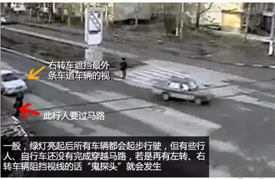 一般,绿灯亮起后所有车辆都会起步行驶,但有些行人、自行车还没有完成穿越路口,若是再有左转、右转车辆阻挡视线的话,“鬼探头”事故就极有可能发生。
