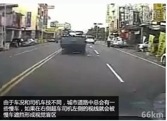 由于车况和驾驶员车技不同,城市道路中总会有一些慢车挡道,有些驾驶员心急就想赶快超过去。如果在右侧超车,驾驶员左侧的视线就会被慢车遮挡形成视觉盲区。如果此时有行人、自行车违章穿越马路以及其他车辆违章转弯或掉头的话, “鬼探头”事故就很容易发生。