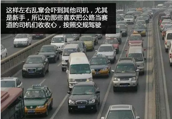 其实这是一种“怒路症”的表现,有些司机在路上极易被慢车激怒,进而暴走开始疯狂并线超车。也许有人非常相信自己的车技,觉得没问题,根本不把限速放在眼里,心中只有“加大油门,拼命冲向目的地”这唯一信念。他们还觉得这样驾车能节省时间,更有甚者还拿“时间就是金钱”这句名言为这种驾驶方式狡辩。这种驾驶方式的确能为你省下几十秒到两三分钟的时间,但这些时间与自己和他人的生命安全相比根本不值一提。