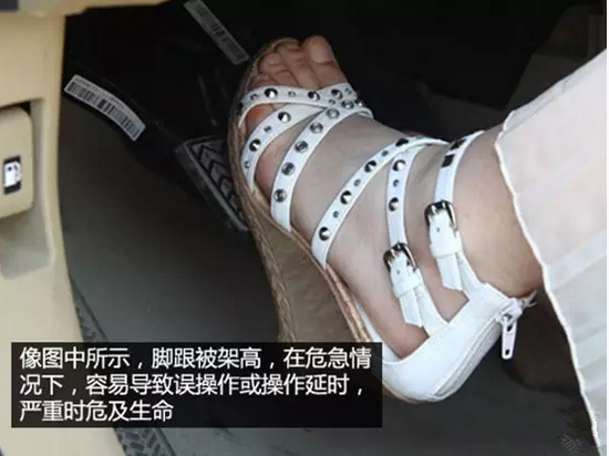 汽车设计师在确定汽车操作踏板的高度和角度时,要考虑许多因素,但却没考虑高跟鞋的因素。穿高跟鞋会把后脚的支点抬高,致使脚后跟不能很好地着地,脚掌无法用力,在需要紧急制动时极易操作失误,很容易在突然用力时从踏板上“滑脚”,从而造成交通事故。